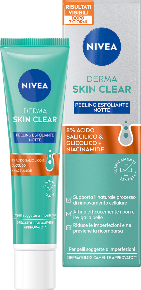 NIVEA DERMA SKIN PEELING NOTTE è un esfoliante viso specificamente formulato per l'utilizzo notturno. Questo trattamento da 40ml della linea dermatologica NIVEA combina l'azione delicata di un peeling chimico con ingredienti rigeneranti, ideale per la pulizia viso profonda. Durante la notte, mentre la pelle riposa, il prodotto rimuove le cellule morte e favorisce il rinnovamento cellulare naturale. La texture leggera penetra facilmente, preparando la pelle a un assorbimento ottimale dei successivi trattamenti. Perfetto per chi desidera una routine di skincare completa e professionale a casa, il peeling notturno NIVEA offre risultati visibili mantenendo il rispetto per la delicatezza cutanea.